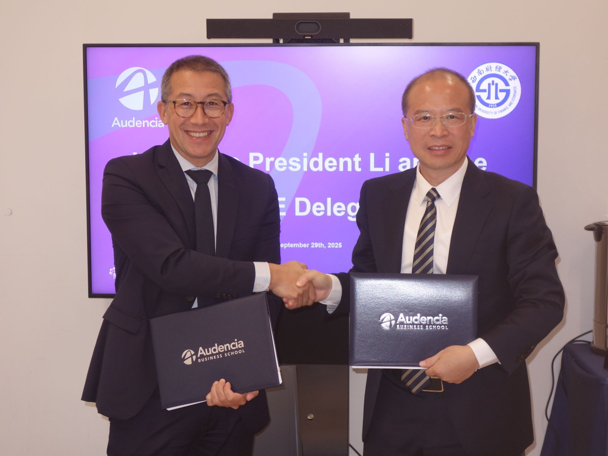 院长塞巴斯蒂安·特兰就进一步整合自身可持续发展领域积淀与我校在绿色金融、企业治理方面优势,就共建中外合作办学项目与我方达成一致意见,双方签署合作举办“企业可持续发展”管理学博士联合培养项目协议。