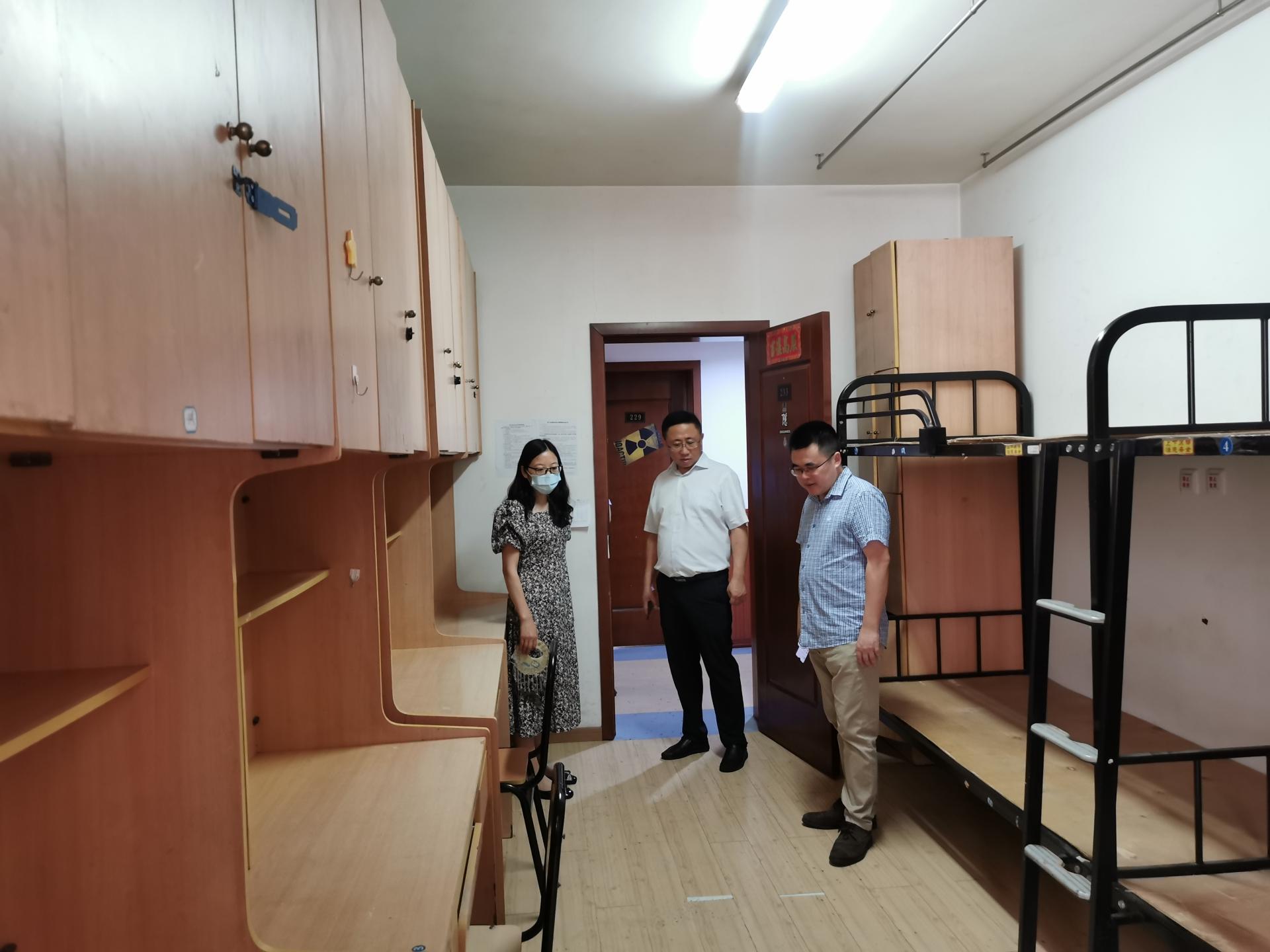 领导仔细询问了结业学生退宿情况以及学生留宿情况,认真听取了设施老化、渗水等问题的情况汇报,并实地查看了宿舍内部,亲自检查了设备设施、墙面楼面及维护情况。
